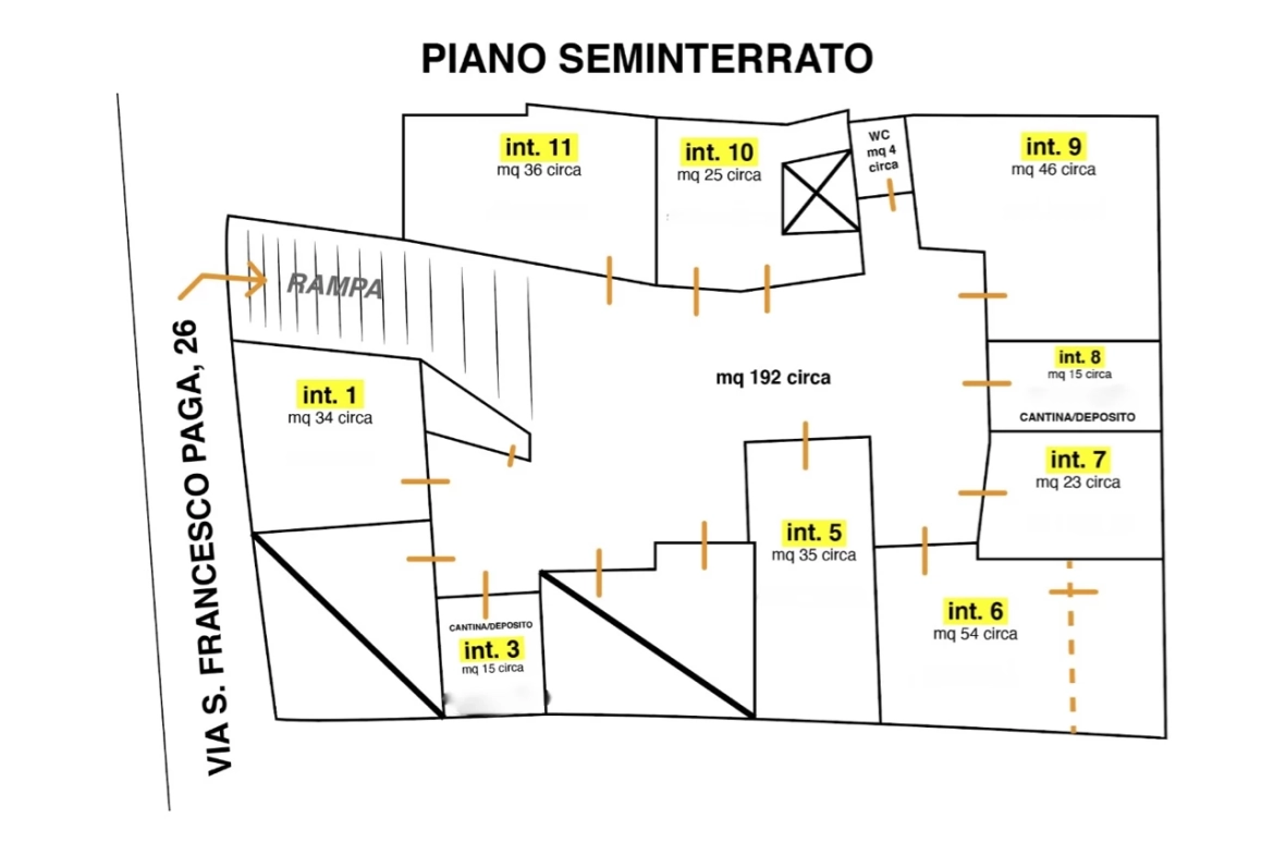 Int. 1 Garage – 33,80 mq – € 25.000; Int. 2 VENDUTO; Int.3 Cantina/Deposito – 14,73 mq – € 14.000; Int. 4 VENDUTO; Int. 5 Garage – 35,56 mq – € 27.000; Int. 6 Garage – 53,70 mq – € 35.000; Int. 7 Garage – 22,83 mq – € 18.000; Int. 8 Cantina/Deposito – 15,49 mq – € 14.000; Int. 9 Garage – 46,19 mq – € 33.000; Int. 10 Garage – 25,06 mq – € 20.000; Int. 11 Garage – 35.58 mq – € 27.000.